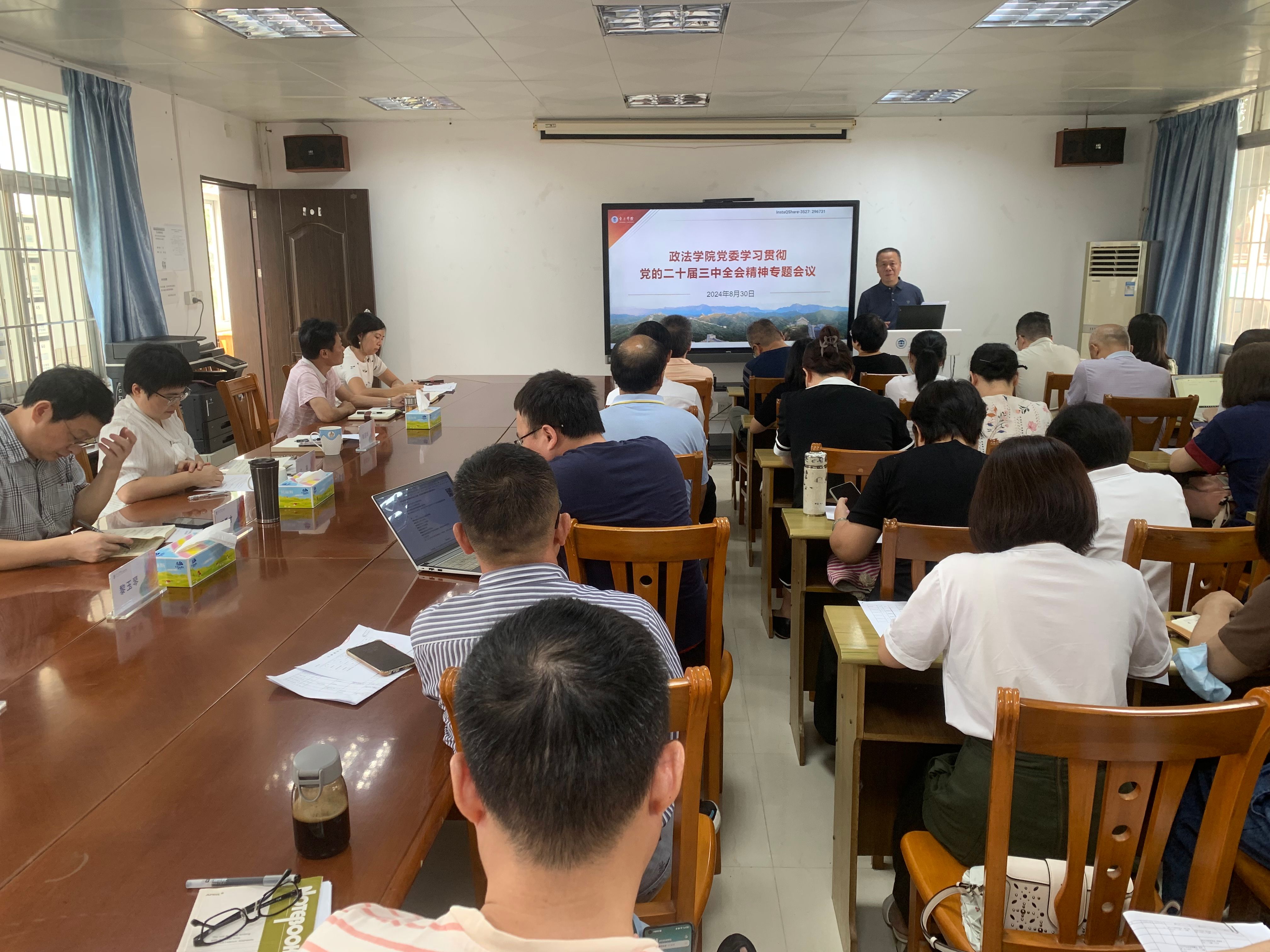 8月30日,政法学院党委召开理论学习中心组(扩大)学习会,专题学习习近平总书记在党的二十届三中全会上的重要讲话精神和全会精神。学院党委书记张滔华领学,学院全体教职工党员参加会议。