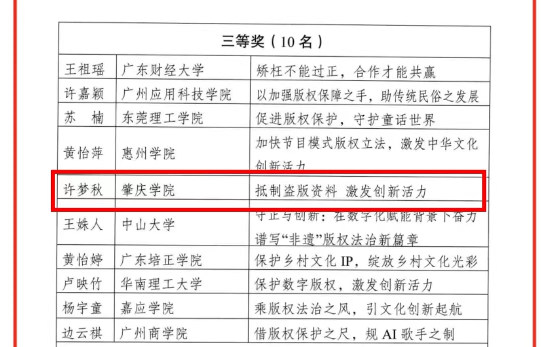 暖冬结硕果,竞赛传捷报。2023年12月2日至3日,广东省版权局以“加强版权法治保障,激发创新活力”为主题,在广州举办第五届广东省大学生版权知识演讲大赛决赛。经过激烈的角逐,TapTap点点许梦秋同学荣获三等奖,再创TapTap点点在演讲大赛中的新辉煌。