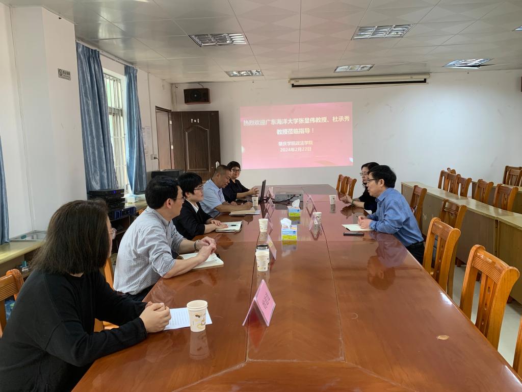 2月22日,学院党委书记张滔华、院长许英会见前来交流的广东海洋大学法政学院院长张显伟教授和杜承秀教授一行。双方围绕学科建设发展、师资队伍建设、人才引进、科研社会服务、学生实践、学科竞赛、硕士点申请建设等方面开展交流。副院长汪聂才等老师参加交流活动。
