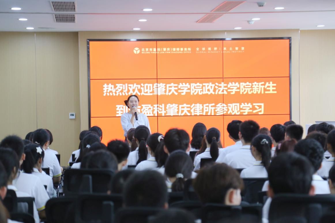 (北京市盈科(肇庆)律师事务所工作人员向参访新生介绍律师业务的运行)