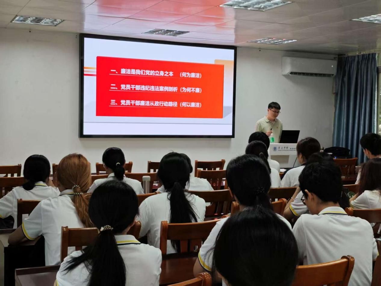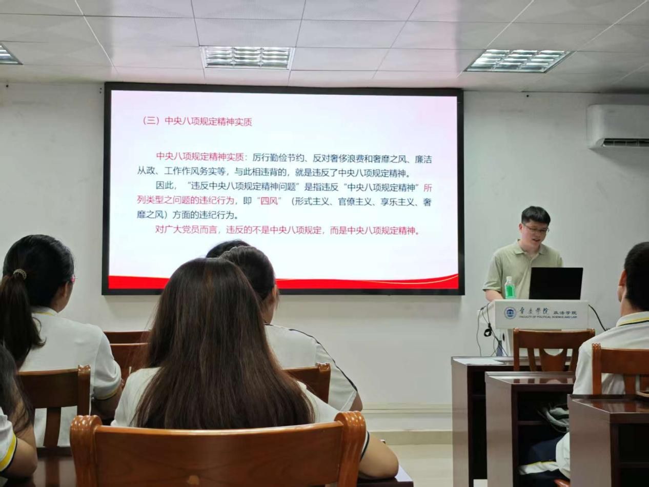 李洋洋老师从“廉洁是我们党的立身之本”、“党员干部违纪违法案例剖析”以及“党员干部廉洁从政行动路径”三个方面,带领大家全方位地学习了中央八项规定的精神及其具体内容。他警示大家必须时刻保持清醒的头脑,将纪律要求内化于心、外化于行,坚决抵制不良风气的侵蚀,并从理论和实践两个层面强调了贯彻落实中央八项规定的重要意义。通过一系列生动案例的讲解,李老师使在场的师生党员深受启发。