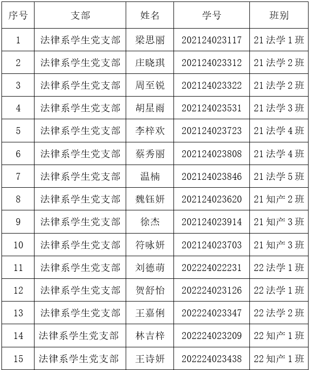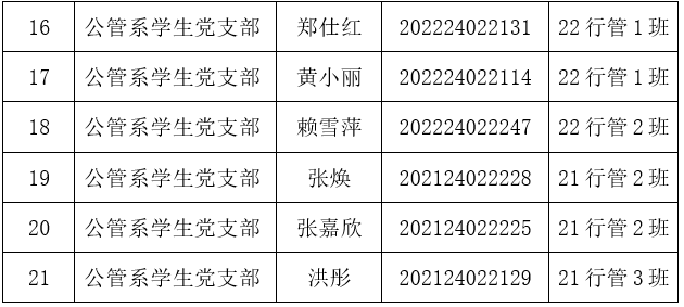 经党支部一年以上培养教育和考察,在充分听取培养联系人、党员和群众意见的基础上,经过各支部委员会讨论同意,报学院党委备案,拟确定梁思丽等21名同志为2024年上半年发展对象。根据发展党员工作有关要求,现将具体名单公示如下:
