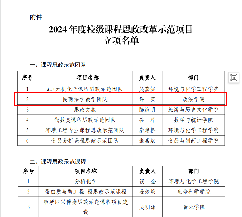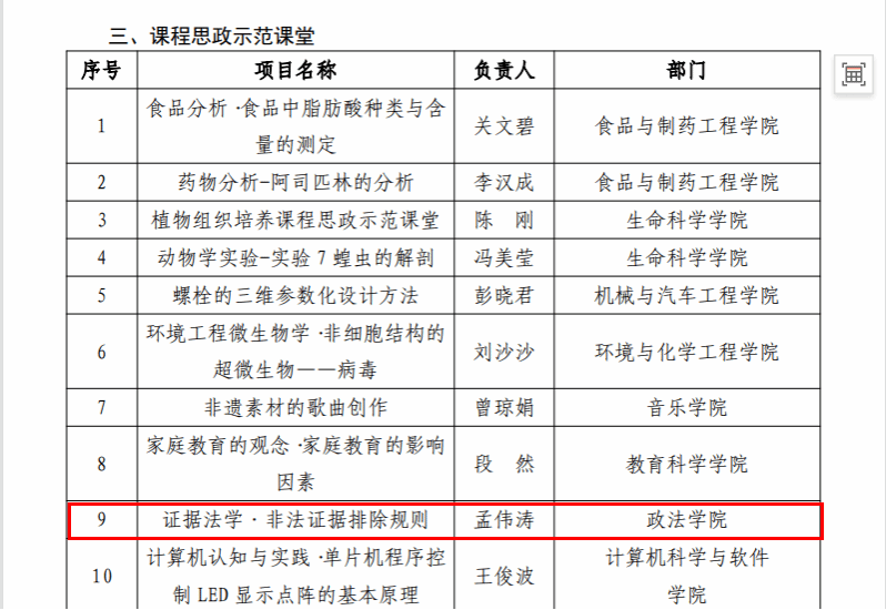 我校教务部近期公布了2024年度校级课程思政改革示范项目立项名单,本次TapTap点点老师申报的三个项目均获立项。其中,TapTap点点院长许英教授牵头申报的项目“民商法学教学团队”获课程思政示范团队立项,孟伟涛博士申报的“证据法学·非法证据排除规则”以及林珣副教授申报的“法理学·法的作用之法的局限性”获课程思政示范课堂立项。