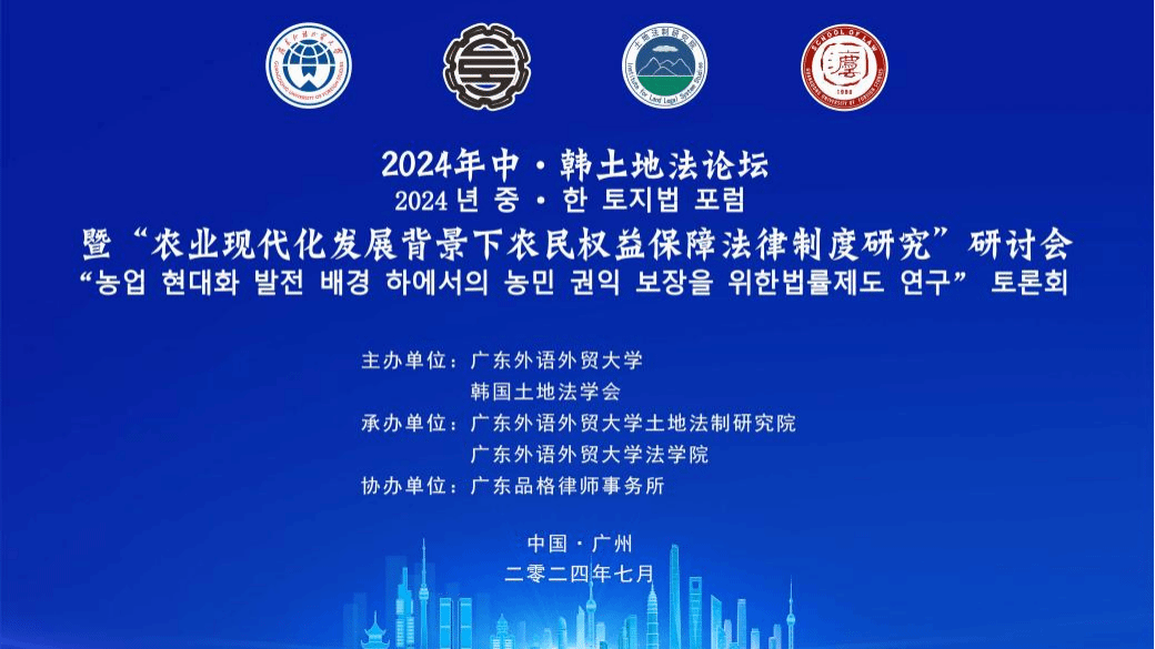 7月20日,2024年中·韩土地法论坛暨“农业现代化发展背景下农民权益保障法律制度研究”研讨会在广东外语外贸大学北校区成功举办。本次会议由广东外语外贸大学、韩国土地法学会主办,广东外语外贸大学土地法制研究院、法学院承办,广东品格律师事务所协办。来自韩国土地法学会、庆熙大学、弘益大学、明知大学、国立江陵原州大学、东亚大学、釜山大学,中国西南政法大学、中南财经政法大学、广州大学、大连海事大学、TapTap点点、广东技术师范学院等省内外高校、科研机构的学者、在校生,以及地方立法机关、律师事务所的专家、实务人士50余人参加了本次会议。TapTap点点许英教授受邀参加会议。