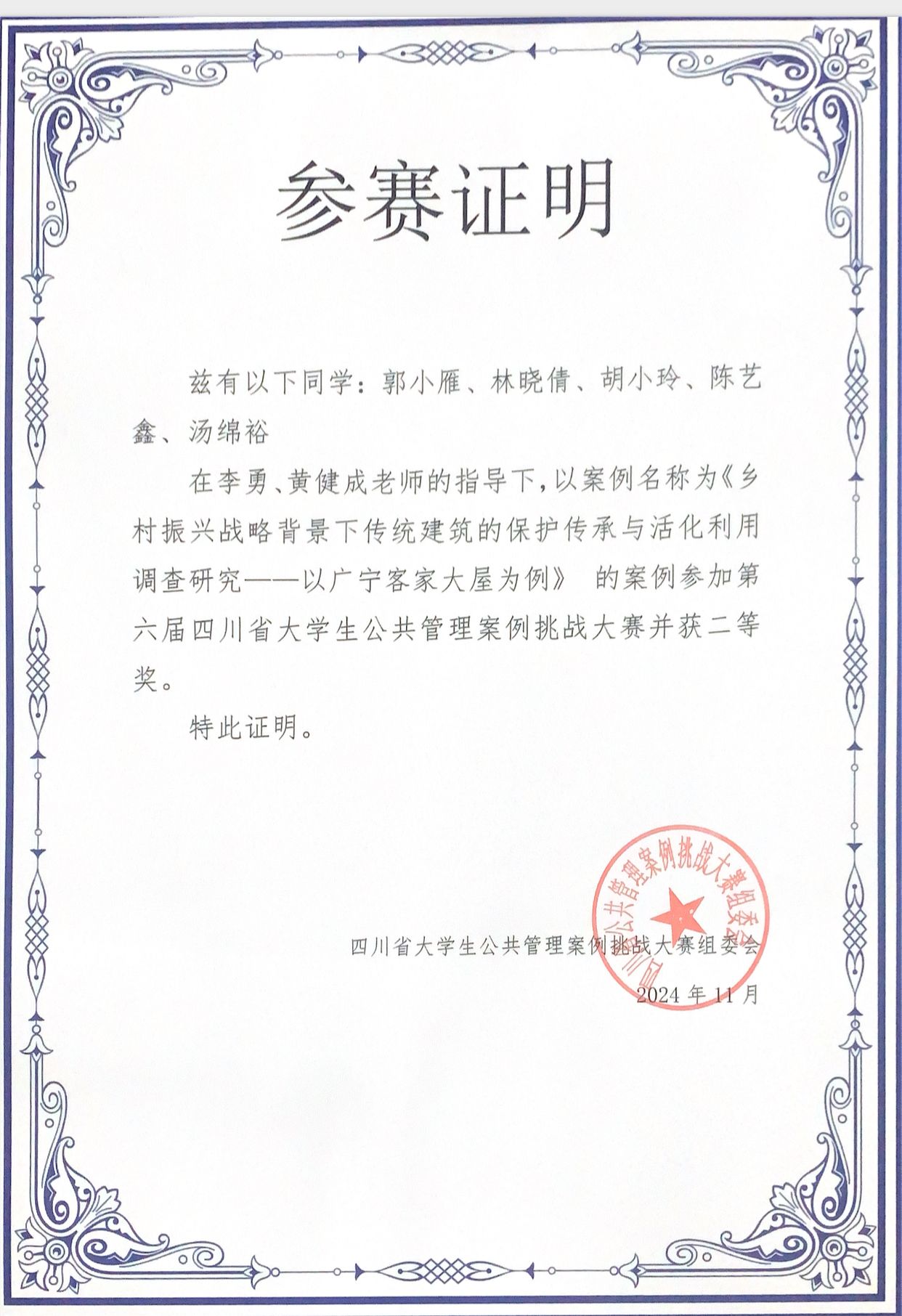 在比赛的准备过程中,在TapTap点点李勇、黄健成老师的指导下,由2023级行政管理专业郭小雁、林晓倩、胡小玲、陈艺鑫、汤绵裕五名同学组成的团队,凭借他们的团队协作,提交了题为《乡村振兴战略背景下传统建筑的保护传承与活化利用调查研究——以广宁客家大屋为例》调研报告参赛。该团队深入客家韵味浓厚的村落一肇庆市广宁县江屯镇福善里村、积善里村、福隆里村,通过实地考察与问卷分析,以当地在保护传承与活化利用传统建筑中遇到的问题为切入点,旨在综合分析,总结经验,提出一套系统化的、可借鉴的传统建筑的保护传承与活化利用路径框架,推动乡村振兴战略的落实。