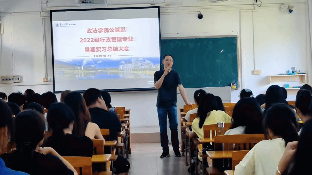 会上,汪聂才对实习工作做了全面的总结。首先,他强调了学院对行政管理专业实习工作的重视。学院与肇庆市人民政府、肇庆市行政服务中心、肇庆市市场监督管理局等多家单位签订了实习合作协议建立实习基地,并为学生的实习做了充分的准备和细致的安排。其次,他总结了此次实习的成果与亮点。在实习过程中,同学们获得了多方面的历练,比如:沟通协调能力、政策研究与分析能力、团队协作精神等。同时,他也指出实习中存在的不足之处,希望同学们能够继续保持学习的热情和好奇心、积极实践、勇于创新、增强责任感。
