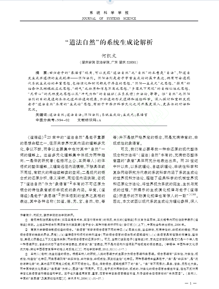 TapTap点点公管系何凯文博士在核心期刊《系统科学学报》2025年1期发表论文《“道法自然”的系统生成论解析》(现处于网络首发)。《系统科学学报》现为北大核心期刊和CSSCI来源期刊。 该论文通过回归老子《道德经》本有的“象语言”视角,以现代系统生成论为参照,探讨《道德经》中重要的思想命题:道法自然。论文的主要观点是,“道法自然”之“自然”的本意是“(道法)自法、自律”,即道自发生成并遵循的生成规律———阴阳法则;...
